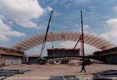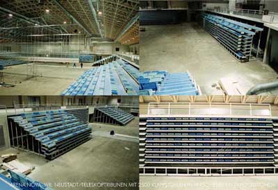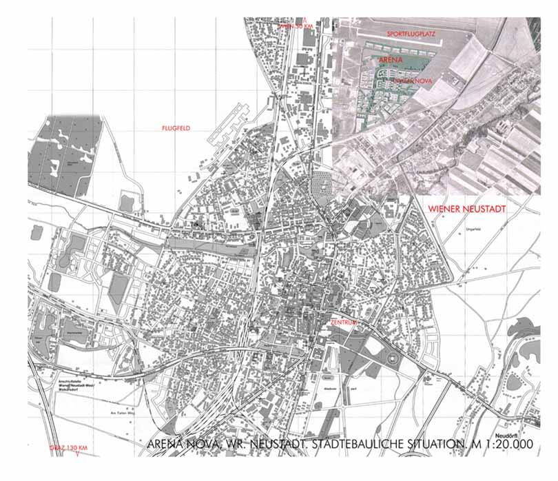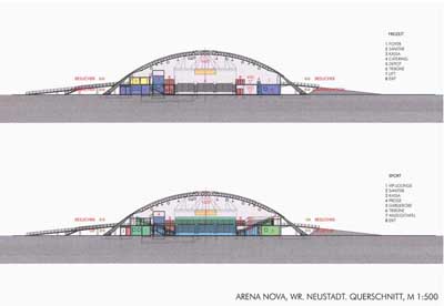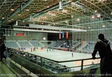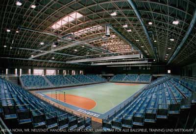 Diese Arena wurde in der Stadt Wiener Neustadt im Rahmen eines Stadterweiterungskonzeptes gebaut. Sie ist eine multifunktionale Veranstaltungshalle für alle Ballsportarten, die darüber hinaus auch für Messen und kulturelle Events gut geeignet ist. Anläßlich der Handball-Weltmeisterschaft für Damen 1995 wurde die Veranstaltungshalle innerhalb nur eines Jahres entworfen und errichtet. Dabei war ein Kostenlimit von 8,4 Mio US- Dollar einzuhalten. Die Halle liegt im Norden der traditionellen Garnisons- und Industriestadt (Stadtplan). Im Umfeld der Arena Nova befinden sich ein Sportflugplatz und Stadterweiterungsgebiete für Wohnbebauung bzw. Gewerbeansiedlung. Angrenzend an die Halle ist eine große Freizeit und Badeanlage geplant. |