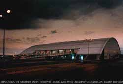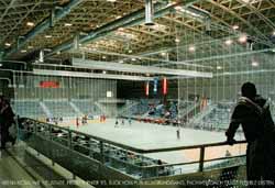 Über insgesamt 12 Außenrampen und Treppenaufgänge wird das obere Zuschauergeschoß der Halle erschlossen. Die große Anzahl und Breite der Zugänge gewährleistet reibungslose und sichere Wege. Die Tribünen sind über den inneren Umgang im Obergeschoß zugänglich. Das Dach wird von einem tonnenförmigen Raumfachwerk aus Holz mit einer maximalen Spannweite von 62 m getragen. Zwei Reihen von je 13 schräggestellten Betonpfeilern an den Längsseiten nehmen die Dachlasten auf. Als Material für die Deckung des Tonnendachs und der Seitenwände wurde Aluminium gewählt, was der Halle ein besonderes Äußeres verleiht. Durch sechs Dachsheds und Fensteröffnungen im Obergeschoß gelangt ausreichend Tageslicht für die Hallenumrüstung in den Innenraum. Als Heizungsanlage wurden fernwärmegespeiste Warmluft- Radiatoren eingebaut, die eine flexible Regelung ermöglichen. Wärmerückgewinnungseinrichtungen ermöglichen die Einsparung der Energiekosten. |